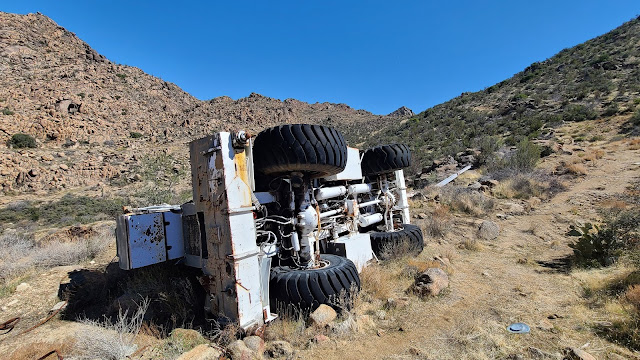 We finally made our way to the fallen crane. And we discovered a memorial cross. At the time, we had no knowledge of the horrific accident that had occurred there. In 2011, a young man of 26 was backing a Rough Terrain crane down the side of this mountain, boom extended. The crane fell over on the side with the cab containing the young man under it. It took the rescue crews 6 hours to extricate him from the wreck, and he was pronounced dead at the scene. Looking at the one photograph we have seen from the accident to the photos we took ourselves, nothing has been moved since the accident. The crane is still lying in the lifted position - the hooks and cables used to lift the crane up to extricate the young man are still lying on the ground.